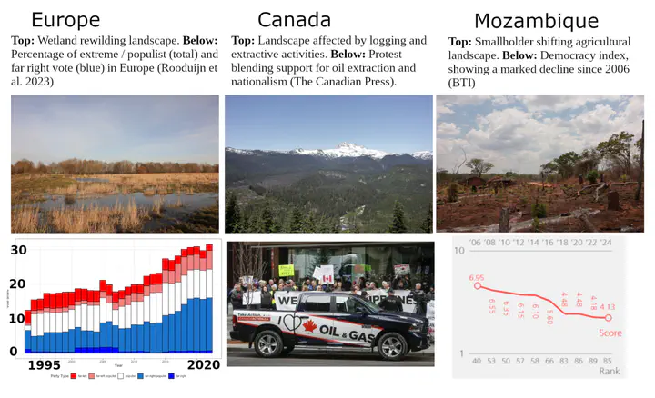 Land use and land systems, i.e. how human societies manage and interact with land through social-ecological systems, are at the core of sustainability issues. Democratic backsliding, i.e. the decline or degradation of the institutions and social norms that sustain democratic societies, is a widespread and impactful trend, with strong but understudied two-ways linkages with land use dynamics. In LUDEMO, we will make key contributions to understanding the linkages between these issues, with (i) explicit articulation and embedding of democratic backsliding concerns and knowledge within land system and sustainability science - moving beyond a focus of democratic backsliding research on social, economic and political aspects, and beyond a focus of sustainability science on policy rather than politics - ; (ii) spatial, quantitative causal analyses of linkages between multiple forms of democratic backsliding and land use changes and related environmental impacts - moving beyond mostly qualitative, political analyses - ; (iii) syntheses and theory building on these two-way interactions. We will investigate these issues through cross-country studies as well as the three focal cases of reactionary forces and agrarianism in Europe’s consolidated rural areas, extractive populism in Canada’s Northern frontiers, and agrarian authoritarianism in Mozambique’s smallholder landscapes.